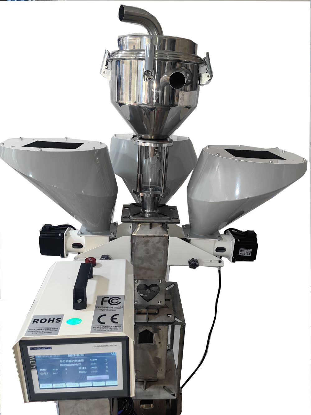 • 雙色自動輔料供料系統(tǒng)能有效解決因填充和原料比重不一導(dǎo)致生產(chǎn)中經(jīng)常出現(xiàn)分散不勻,產(chǎn)品質(zhì)量參差不齊問題,降低成本,減少廢品,使生產(chǎn)配料及改單更加靈活便捷,可以及時增加或降低的添加比例,使用生產(chǎn)更加靈活方便調(diào)配,成本既時降低或廢品減少,精確控制顏色快速改色免洗斗,對使用具有有效期的助劑可控添加。